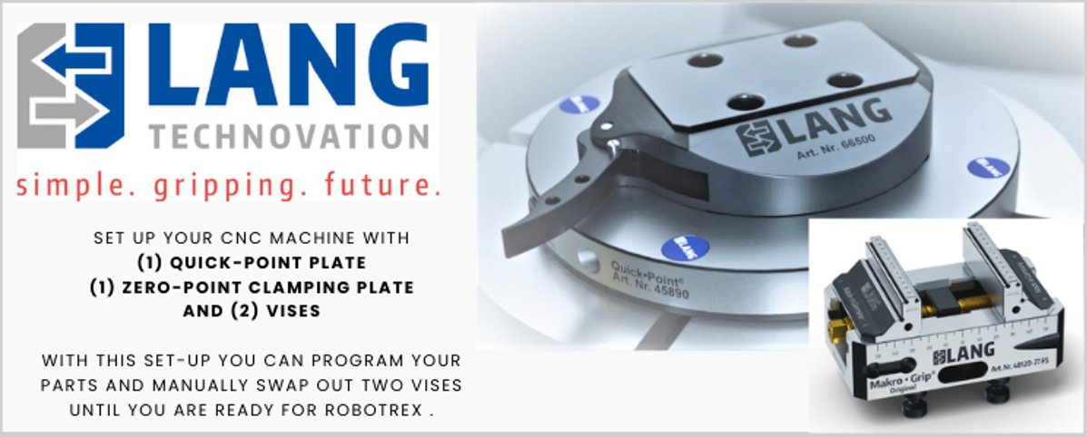LANG Technik - USA offers best in class workholding products and their highly experienced applications engineers have drastically increased productivity for hundreds of machine shops in the US. In addition, LANG Technik – USA has teamed up with the Metalcraft Automation Group and together they can transition your machine shop towards a more productive and efficient future with CNC automation with RoboTrex.